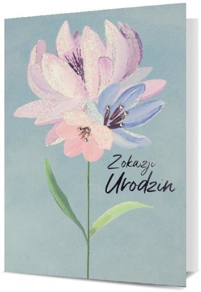 Pięknie zdobiony karnet okolicznościowy B6 z kopertą i życzeniami.Brokat, przestrzenne aplikacje, złocona folia.