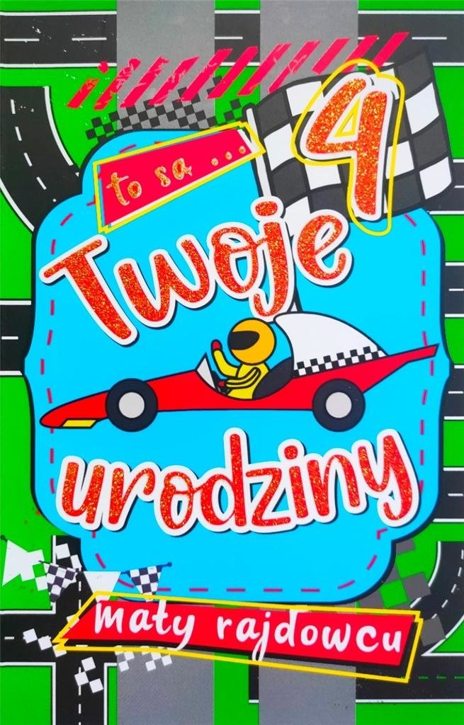 Karnet 2k. Klasyczny karnet na dziecięce urodziny. Uszlachetniony lakierem brokatowym. Karnet zawiera życzenia.
