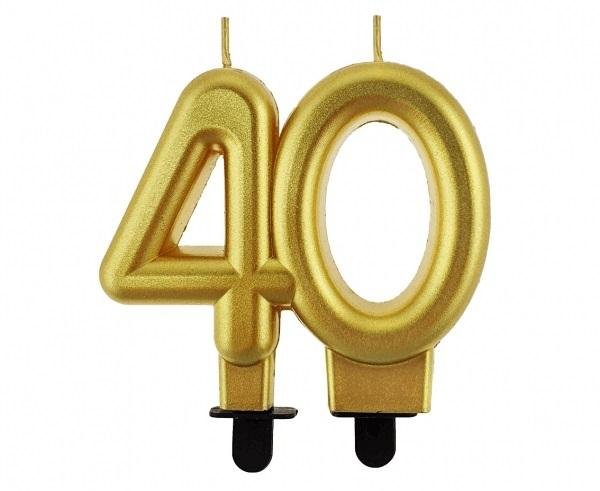 Narozeninová svíčka na dort. Svíčka ve tvaru čísla 40. Barva: metalická zlatá. Balení: 1 ks. velikost: 8 cm