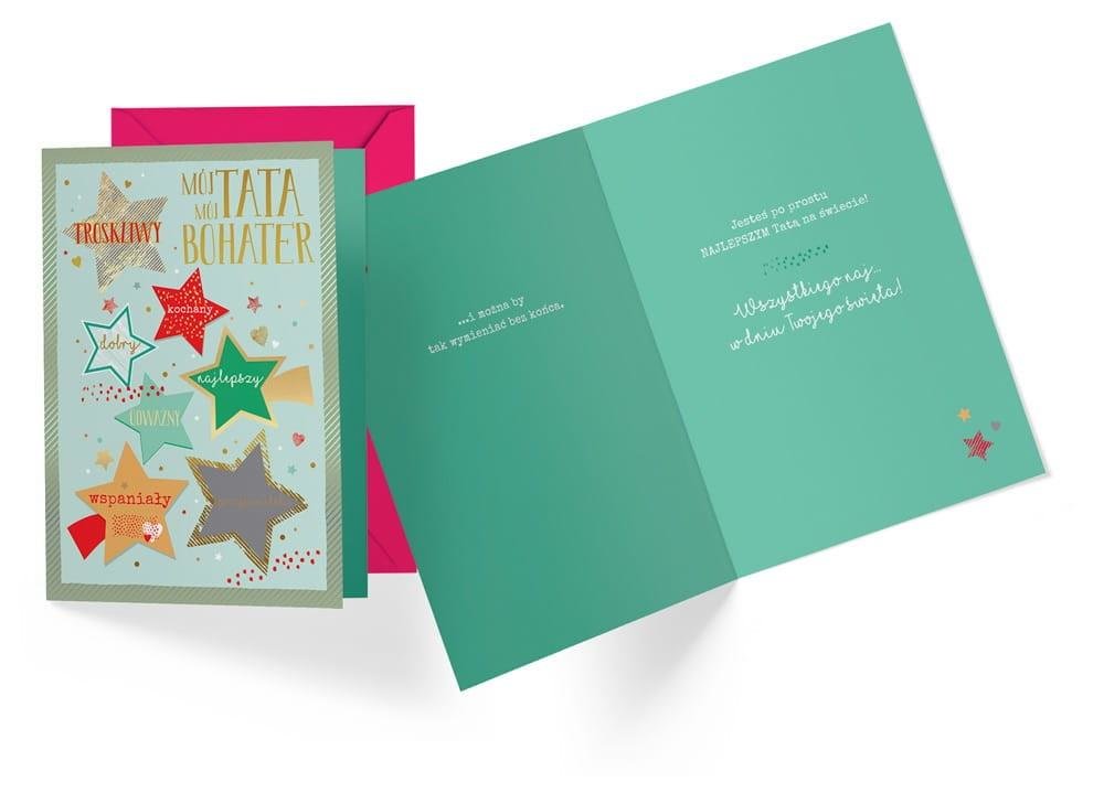 Kartki z serii Passion Premium to świetny pomysł na piękną pamiątkę w super cenie. Każda kartka PR jest zdobiona przynajmniej dwoma rodzajami uszlachetnień - metaliczne lub perłowe folie, brokat, tłoczenie itp. - tyle piękna w takim drobiazgu! Każda kartka Passion Premium ma kolorowe wnętrze z tekstem wyjątkowych życzeń i grafiką, w komplecie jest także dopasowana kolorystycznie koperta. Cechy szczególne: wielkość: B6, 16.6 x 11.7 cm po złożeniu, koperta: dopasowana w zestawie, zdobienia: przynajmniej dwa rodzaje, często więcej - złota, srebrna lub perłowa folia, brokat, tłoczenia, wnętrze kartki: kolorowe, z życzeniami, okazja: Dzień Ojca.