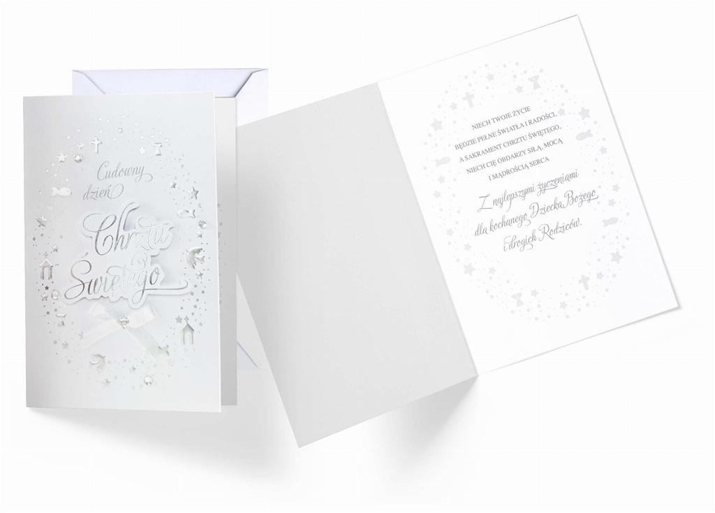 Kartka B6 z ozdobnej serii Dream Cards na Chrzest - nieduża, ale robi wrażenie dzięki atrakcyjnej kolorystyce i ciekawym zdobieniom. To idealny wybór łączący przyjazną cenę z jakością. Cechy szczególne: wielkość: B6, 16.6 x 11.7 cm po złożeniu, koperta: w zestawie, kolorowa, zdobienia: różnorodne, bogate (w zależności od wzoru: przyklejane dekoracje, elementy biżuteryjne, odstawniki, brokat metaliczne folie, tłoczenia itp.), okazja: Chrzest
