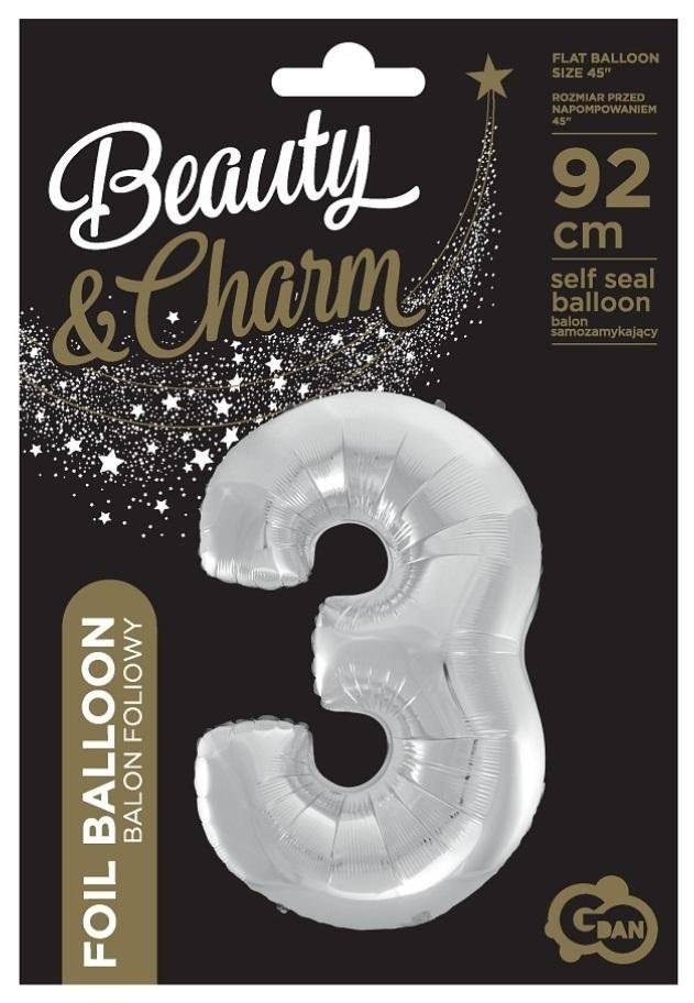 Balon foliowy cyfra 3 Beauty&Charm srebrna 92cm