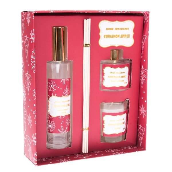 Objevte kombinaci, která přináší teplo a útulnost do každého kouta vašeho domova. Tento set vonného spreje, difuzéru a svíčky s aroma skořice a jablka je skvělým způsobem, jak rychle a efektivně proměnit atmosféru vašeho bytu i kanceláře.