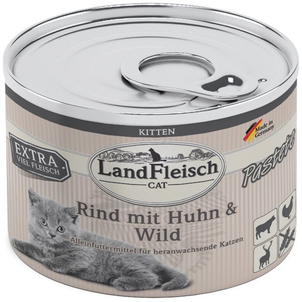 Kompletní krmivo LandFleisch Cat pro koťata všech plemen s vysokým podílem kvalitního hovězího, kuřecího masa a zvěřiny. Kompletní krmivo LandFleisch Cat nabízí vysoce kvalitní bílkoviny, esenciální aminokyseliny a výživově přizpůsobené doplňky cenných vitamínů, které optimální základ pro zdravou a holistickou výživu vaší kočky. Konzervy jsou doplněné o vysoce kvalitní tuky zajišťuje zdravou a lesklou srst. Vysoký podíl čerstvých, lahodně masitých surovin z chovu zvířat vhodných pro daný druh a jedinečné kvality surovin vede k dobré snášenlivosti a vysoké přijatelnosti. Při výrobě vyváženého kompletního krmiva z místních surovin. Díky šetrnému procesu výroby plnění za studena zaručuje složení LandFleisch Cat maximální požitek pro vaši kočku. Bez umělých barviv, umělých dochucovadel a konzervačních látek. Výroba je v Německu a zvláštní důraz je kladen na původ surovin. Složení: 68% masa a vedlejších produktů živočišného původu (z toho 40% hovězího masa, plic, jater; 21% kuřete z masa, srdcí, krků; 7% zvěřiny z masa, drobů), minerály Doplňkové látky: Vitamin A: 2 500 IU; Vitamín D3 (E671): 250 IU; vitamín E: 25 mg; biotin 25 µg. Analytické složky: Hrubá bílkovina: 11,0 %,Hrubý tuk: 5,5 %,Hrubý popel: 2,2 %, Hrubá vláknina: 0,2 %, 0,3 % vápník, 0,23 % fosfor, vlhkost: 78,5 %. Doplňkové látky / kg: Doplňky výživy: Vitamin E: 25 mg, Vitamin D3 200IE, Taurin: 450 mg, Zinek jako oxid zinečnatý: 20 mg, Jód jako bezvodý jodičnan vápenatý: 0,75 mg Technologická aditiva: Cassia-gum 2500 mg. Doporučené denní dávkování: Věk kočky Množství za den do 4 měs. 220-280g 4-8 měs. 280-360g 9-12 měs 320-350g Aktuální požadavky závisí na rase, věku a úrovni aktivity kočky. Krmte při pokojové teplotě. Může obsahovat stopy dalších přísad. Skladujte na chladném a suchém místě. Po otevření skladujte na chladném místě a spotřebujte do 2 dnů. Minimální trvanlivost a identifikační číslo šarže: viz štítek na dně nebo víku konzervy.