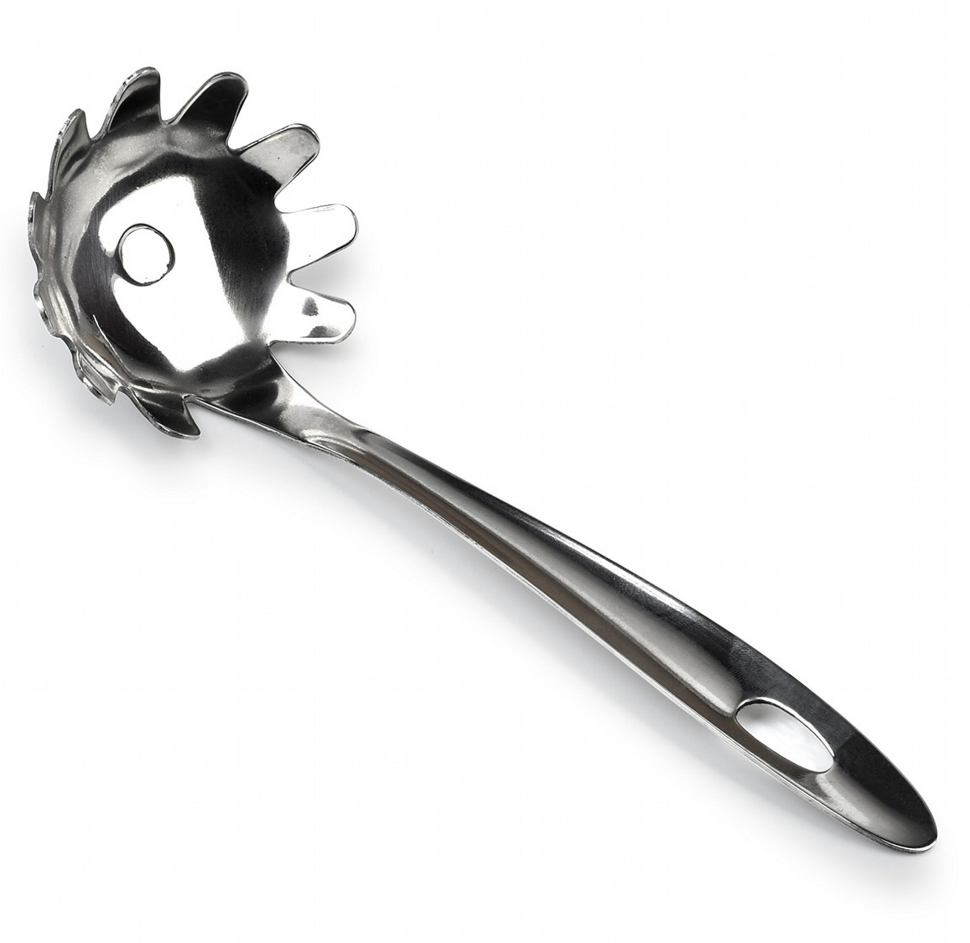 Lžíce na špagety je malé a lehké kuchyňské náčiní, jehož design a tvar vám umožní pohodlně odstraňovat vodu z těstovin, jako jsou špagety nebo tagliatelle. Díky dobře tvarované rukojeti se pohodlně používá a jeho stabilní tvar umožňuje bezpečné vypouštění vody. Lžíce je vyrobena výhradně z nerezové oceli. Lžíci lze mýt v myčce nádobí.