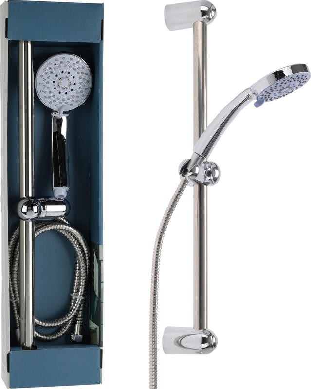 HAND SHOWER WITH 5 FUNCTIONS DIA 95MM IN CHROME COLOUR, 150CM STAINLESS STEEL SHOWER HOSE, DIA 13MM, POLISH FINISH, PV INNER TUBE, PP NUTS, ONE ENDING WITH PP NUT F1/2 INCH, ONE ENDING WITH ZINC NUT F1/2 INCH, SHOWER BAR WITHOUT SOAP HOLDER TOTAL LENGTH: 60CM, DIA 25MM. EACH PACKED IN COLOUR BOX/ 160X75X602MM, Colour box with window: 1 X Hand shower 95mm, ABS,1 X Shower hose 150mm, Stainless steel/..., 13X13X1.500MM,1 X Shower bar 60cm, Stainless steel, 25X25X600MM / CFT 1,73,(8.188/40ft HQ)