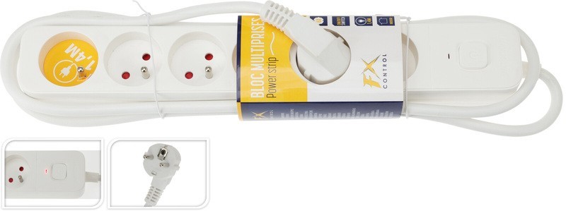POWER SOCKET, 6 WAY FRENCH STYLE, WITH CHILD PROTECTION, WITH SWITCH, REAL VISIBLE CABLE LENGTH: 140CM, REAL 3X 1,5MM2 COPPER WIRE, WHITE COLOUR. ACCORDING TO CE, ROHS, PACKING WITH COLOUR SLEEVE AND PP HANGER AND SMALL ROUND SIZE INDICATOR INSIDE SOCKET/ 80X65X400MM, Sleeve: WEEE / CFT...