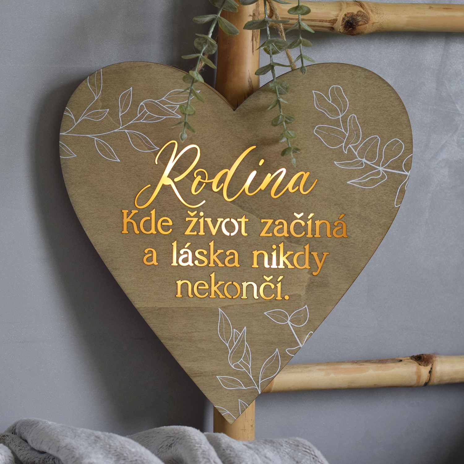 Dřevěná dekorace se svítícím citátem potištěná větvičkami eukalyptu. Toto krásné srdce Vám doma udělá útulný efekt, který okouzlí každou návštěvu.rozměr: 30 x 29,5 cmLed srdce se zapíná pomocí ovladače ze zadní strany a je napájeno pomocí dvou AA tužkových baterií. (Baterie nejsou součístí srdíčka.)