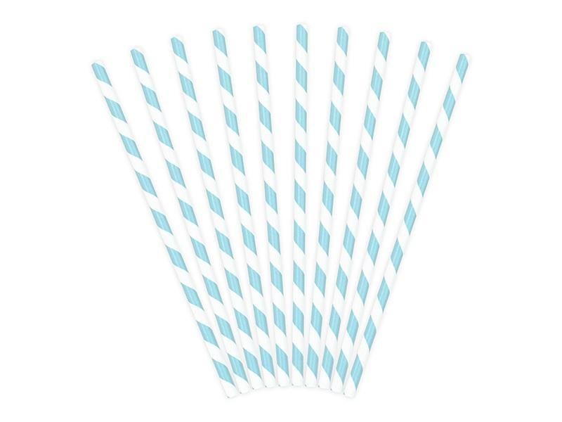 Słomki papierowe w kolorze błękitnym z białymi ukośnymi paskami, długość około 19,5 centymetra.(1 op. / 10 szt.) číst celé