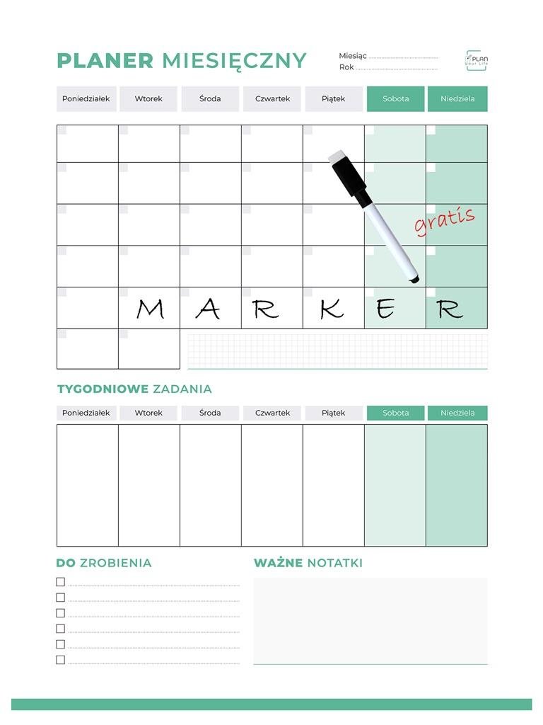 PLANER MIESIĘCZNY MAGNETYCZNY - zielony Marka: Plan Your Life Wymiary: 60 x 45 cm Planer wyposażony jest w magnetyczny podkład, dzięki czemu można go ulokować na lodówce jak i każdej innej powierzchni metalowej. Planer ten znacznie ułatwi zaplanowanie obowiązków i najważniejszych wydarzeń nadchodzącego miesiąca, nadaję się zarówno do domu, szkoły czy biura. Mocny magnes i warstwowa budowa Silny magnes powoduje, że planer się nie zsuwa i nie przemieszcza podczas pisania. Wytrzymała powierzchnia z nanomateriałów ułatwiająca ścieranie - sprawi, że planer będzie Ci długo służył nawet podczas bardzo intensywnego użytkowania! Do każdego planera marker GRATIS.