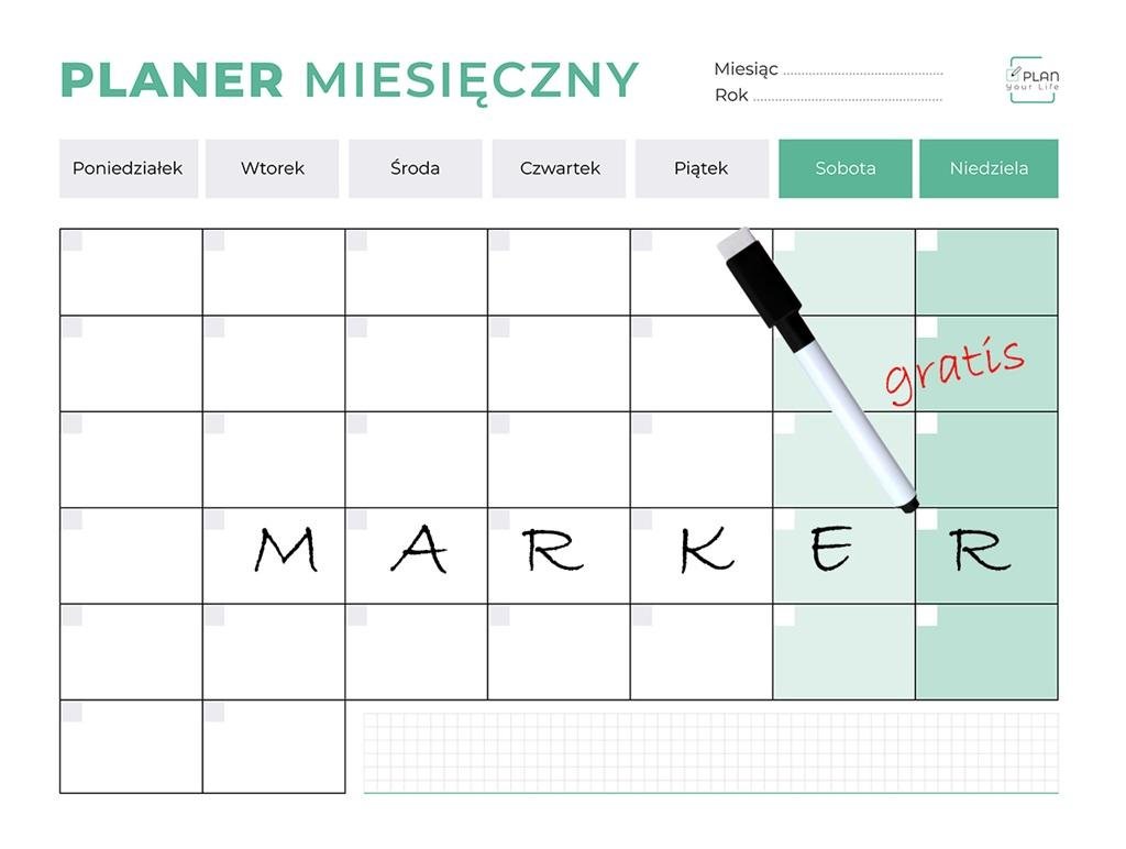 PLANER MIESIĘCZNY MAGNETYCZNY - zielony Marka: Plan Your Life Wymiary: 40 x 30 cm Planer wyposażony jest w magnetyczny podkład, dzięki czemu można go ulokować na lodówce jak i każdej innej powierzchni metalowej. Planer ten znacznie ułatwi zaplanowanie obowiązków i najważniejszych wydarzeń nadchodzącego miesiąca, nadaję się zarówno do domu, szkoły czy biura. Mocny magnes i warstwowa budowa Silny magnes powoduje, że planer się nie zsuwa i nie przemieszcza podczas pisania. Wytrzymała powierzchnia z nanomateriałów ułatwiająca ścieranie - sprawi, że planer będzie Ci długo służył nawet podczas bardzo intensywnego użytkowania! Do każdego planera marker GRATIS.