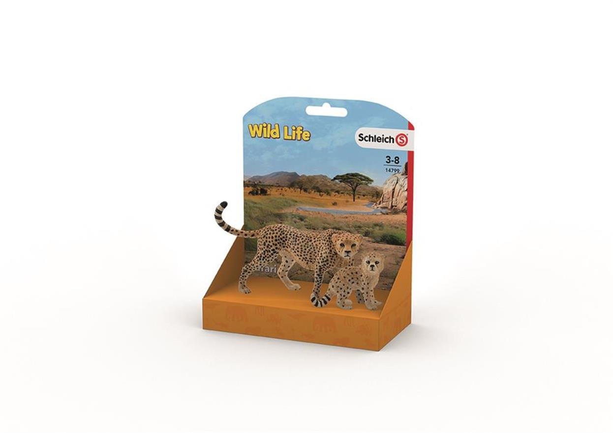 Sada dvou zvířátek - Samice Geparda a mládě. Samice Geparda a její mládě je krásná, ručně malovaná figurka. Gepardi jsou nejrychlejší zvířata na světě. Díky jejich štíhlému a silnému tělu a dlouhým nohám, dokážou zrychlit až na 120 km/h během několika vteřin. Gepardi jsou vynikající lovci. Nejdříve se velmi opatrně blíží ke své kořisti, dokud od ní není vzdálený pár metrů a poté se, ve správný čas, rozběhne rychlostí blesku. Pokud kořist náhle změní směr, Gepard jednoduše otočí své tělo v polovině skoku. Jeho flexibilní páteř mu to umožňuje. Nicméně, pokud se mu po několika metrech nepodaří kořist chytit, vzdává to. To, že běží tak vysokou rychlostí, jej moc oslabuje a vydří v tomto tempu jen na krátkou vzdálenost. Gepardi jsou dokonale přizpůsobeni pro pobyt v savaně. Vodu potřebují pít každé tři až čtyři dny. Rozměr samice Geparda: 9,8 x 6,5 x 3,6 cm. Rozměr mládě: 4,9 x 3,7 x 2,5 cm. Nevhodné pro děti do 3 let. Doporučený věk: 3-8