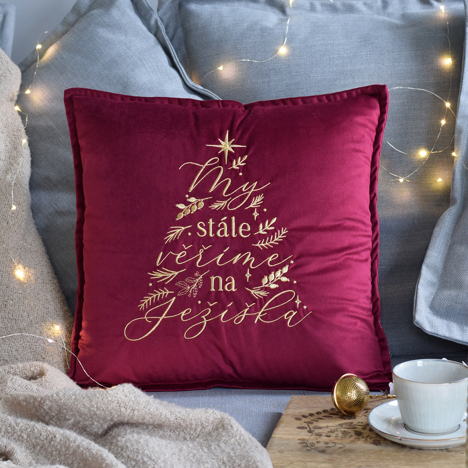 Jste milovníky Vánoc a tak trochu stále skrytě věříte na Ježíška? Krásná bordó červená doplněná o motiv vánočního stromečku vyšívaného zlatou nití. To je elegantní kombinace vyjímečného polštářku, který prostě musíte mít!
