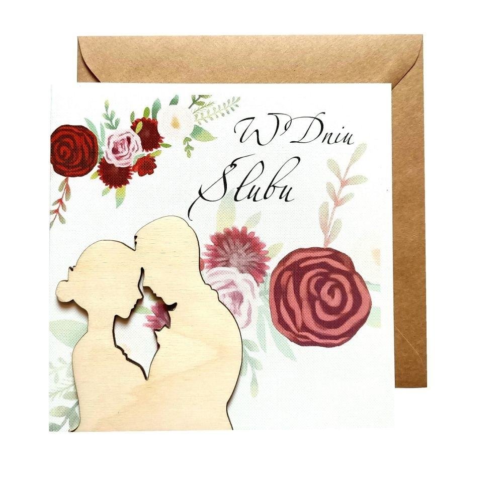 Kartka okolicznościowa z okazji Ślubu o treści: Idźcie przez życie z dobrocią w sercu, otoczeni ludźmi których kochacie. Silni poczuciem bezpieczeństwa i szczęścia? Nierozłączni! Wszystkiego dobrego na nowej drodze życia.