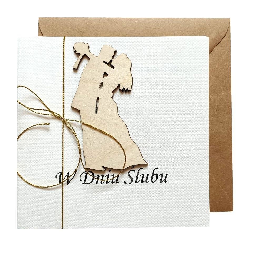 Kartka okolicznościowa z okazji Ślubu o treści: Z Bożej woli połączeni węzłem, co dwoje serc tych splata, żyjcie szczęśliwie tu na ziemi, niech Wam w miłości płyną lata. Niech miłość, dobroć oraz ufność, która dziś w sercach Waszych gości wraz z Bożą łaską i pomocą da Wam moc szczęścia i radości. Młodej parze z najlepszymi życzeniami?