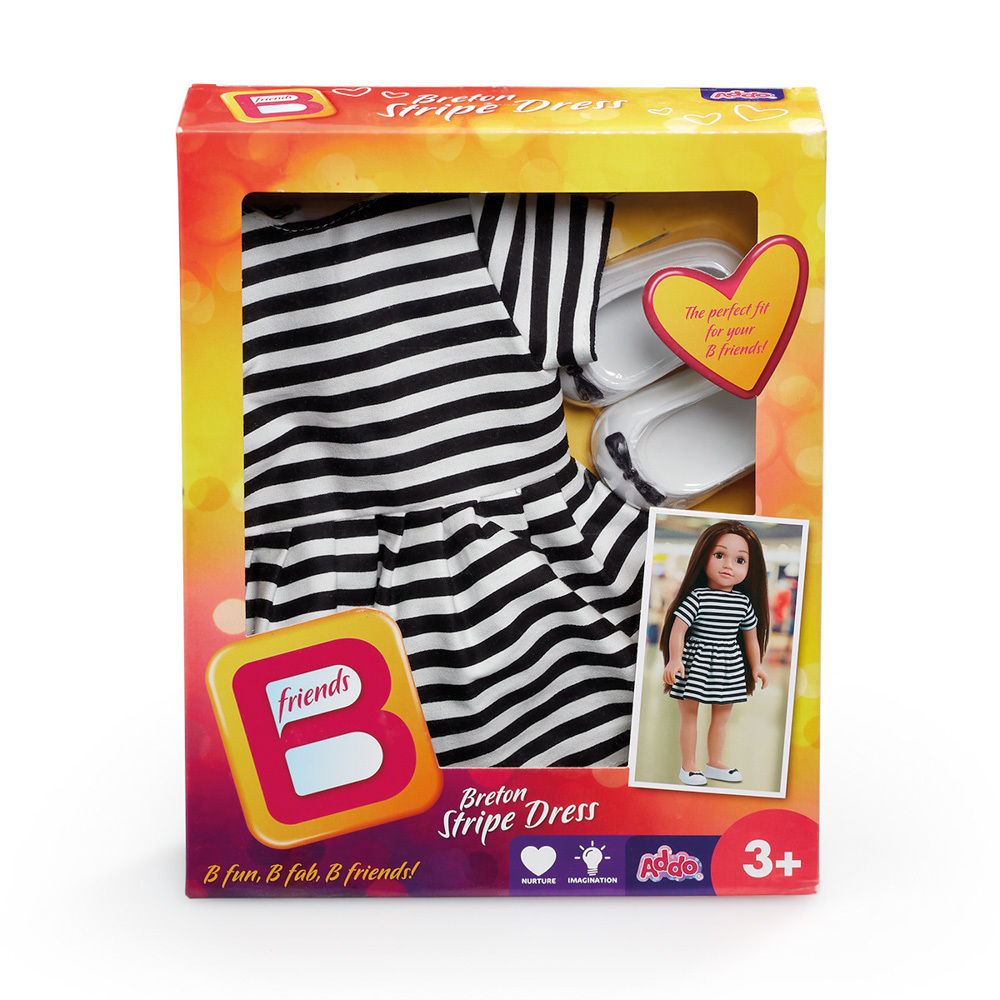 Stylové letní šaty s černými a bílými pruhy a bílé střevíčky s černou mašličkou padnou všem panenkám B Friends s výškou 45 cm. Kombinujte oblečení a doplňky panenek a vytvořte tak svůj jedinečný styl! Věk: 3+ číst celé