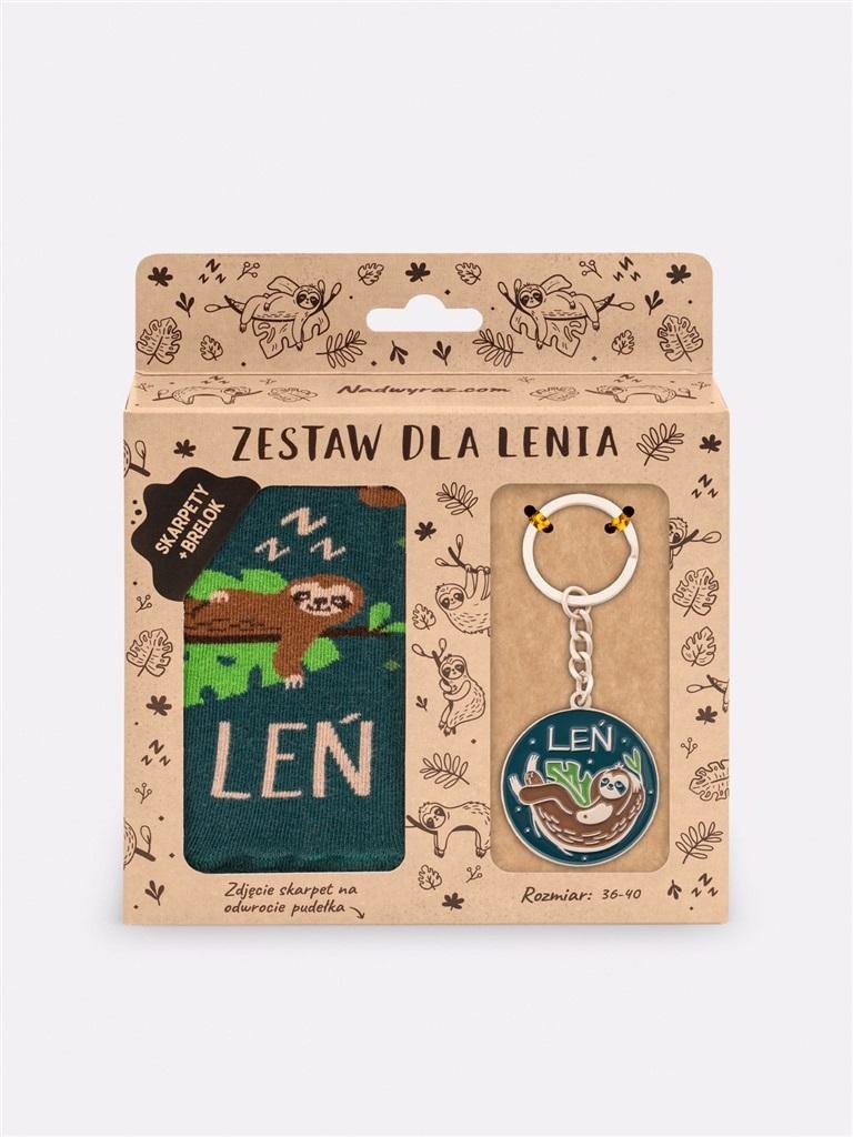 "Jeszcze tylko pięć minut" to najpopularniejsza maksyma śpiochów, leniwych istot i mistrzów prokrastynacji. Z myślą o nich stworzyliśmy zestaw, w skład którego wchodzą brelok i urocze skarpetki w leniwce w kolorze butelkowej zieleni! Zestaw DLA LENIA to idealny pomysł na prezent dla zdolnych, ale leniwych. Możesz go również podarować pracowitej mrówce, która nie potrafi odpoczywać. Niech przypomina jej o tym, że błogie nicnierobienie to konieczny proces każdej pracy! Skarpety: Dla waćpani Skład: 80% najwyższej jakości bawełna czesana, 17% poliamid (dodaje wytrzymałości), 3% elastan (skarpetka lepiej dopasowuje się do stopy) Nieuciskający ściągacz i komfortowy płaski szew na palcach Wyprodukowano w Polsce Prać zawsze na lewej stronie w temperaturze maks. 40 C, nie prasować. Brelok z zawieszką do kluczy: Średnica: 4 cm Wykonany z metalu, pokryty emalią Wyprodukowano w Polsce Zestaw: Wymiary pudełka 15,5 cm x 3 cm x 17,5 cm Idealny prezent dla zdolnych, acz leniwych