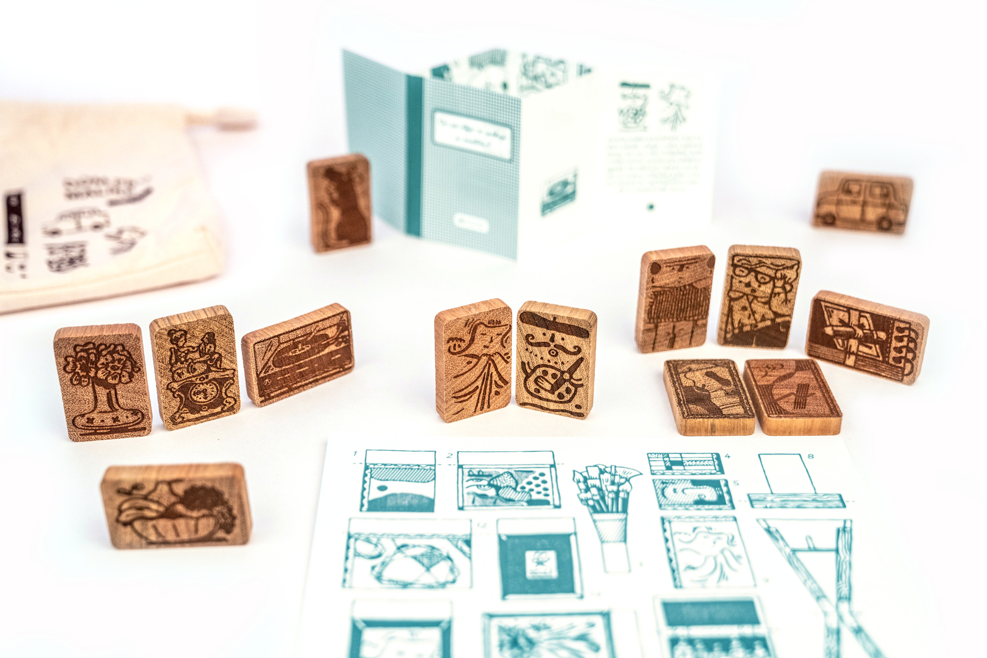 Materiál: Kostky jsou vyrobeny z tropického dřeva Jatoby, obrázky gravírované, vystřihovánka s miniknížkou z papíru, pytlík ze 100% bavlny.