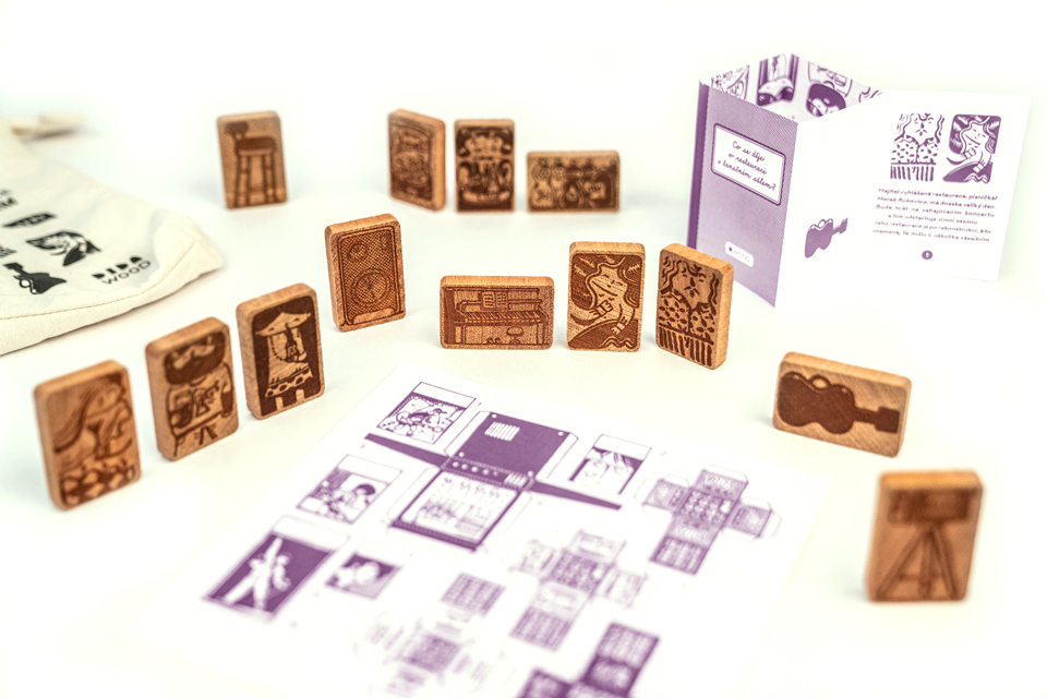 Materiál: kostky jsou vyrobeny z tropického dřeva Jatoby, obrázky gravírované, vystřihovánka s miniknížkou z papíru, pytlík ze 100% bavlny