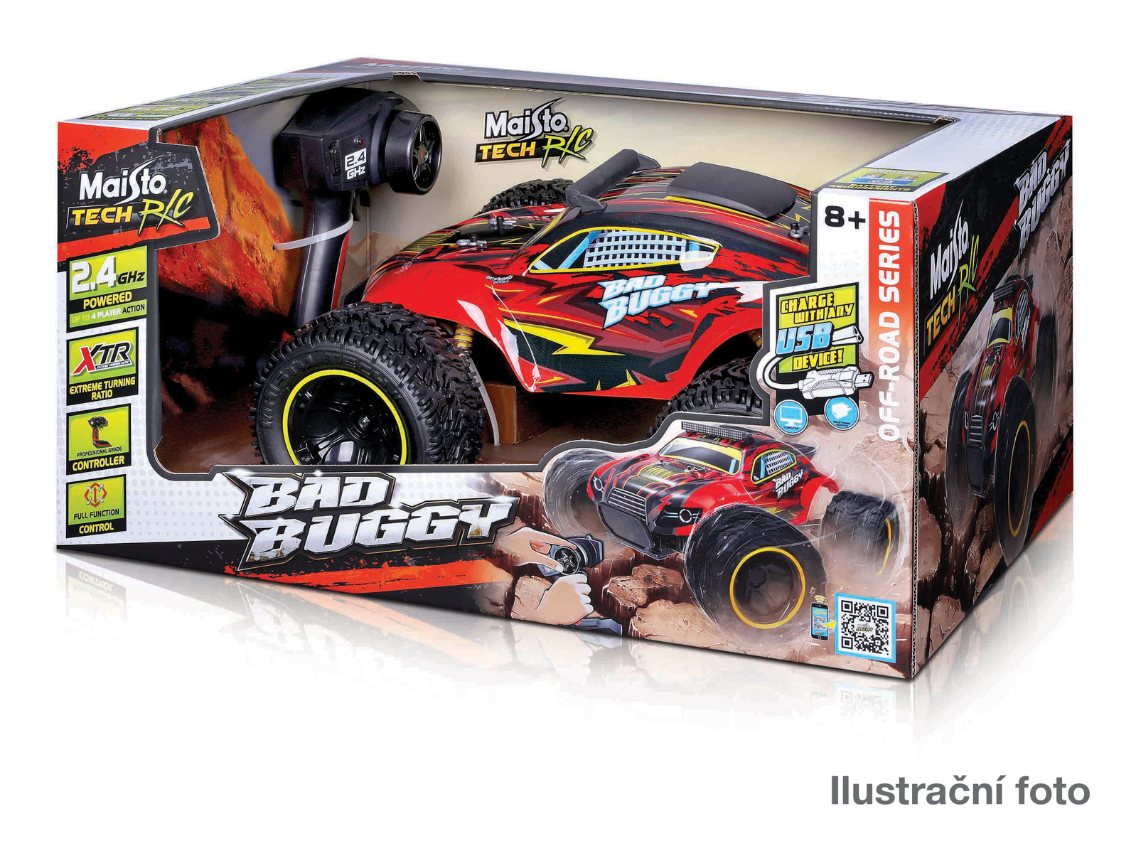 Tech RC, Bad Buggy. Dálkově ovládaný špičkový RC model + mohutné terénní pneumatiky. Vozidlo: akumulátor 6V NiMH (900 mAh) + nabíjení pomocí USB. Ovladač s proporcionálním ovládáním rychlosti: 2 ks baterie AA 1,5V, které jsou součástí balení. Dosah vysílače: 35 metrů, rychlost: 17,3 km/h, doba jízdy: 12 minut. Frekvence 2,4 GHz umožňuje souběžnou jízdu až se 4 RC modely. Délka modelu cca 37 cm, šířka modelu cca 36 cm.Nevhodné pro děti do 3 let. Věk: 8+