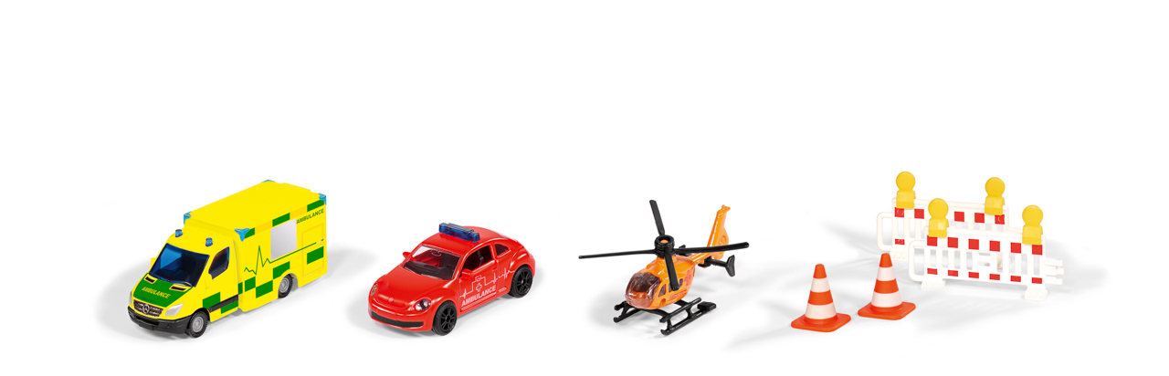 V nouzi se počítá každá vteřina. Je proto důležité, aby se na místo rychle dostala záchranná služba. Ať už na cestách nebo ze vzduchu - se sadou Rescue od siku brzy dorazí pomoc, protože záchranáři jsou již na cestě! Sada se skládá ze tří modelů vozidel a různého příslušenství. VW Beetle s mezinárodním označením „Ambulance“ funguje jako vozidlo pohotovostního lékaře. Má červený nátěr pohotovostní služby a na střeše tyč nouzového osvětlení. Dveře vozidla lze otevřít. Záchrannému vozidlu rychle pomáhá vyprošťovací vozidlo, jasně žlutý Mercedes Sprinter s podrobným vícebarevným signálním značením a zeleným nápisem „Ambulance“ po stranách. Pro leteckou podporu je nasazen i vrtulník. Jeho rotorové listy lze složit a rotor lze otáčet. Pro zabezpečení místa nehody sada dále obsahuje dvě výstražné zábrany a dva oranžovo/bílé kužely. Rozměry balení: 29,6 x 11 x 4,8 cm. Věk: 3+