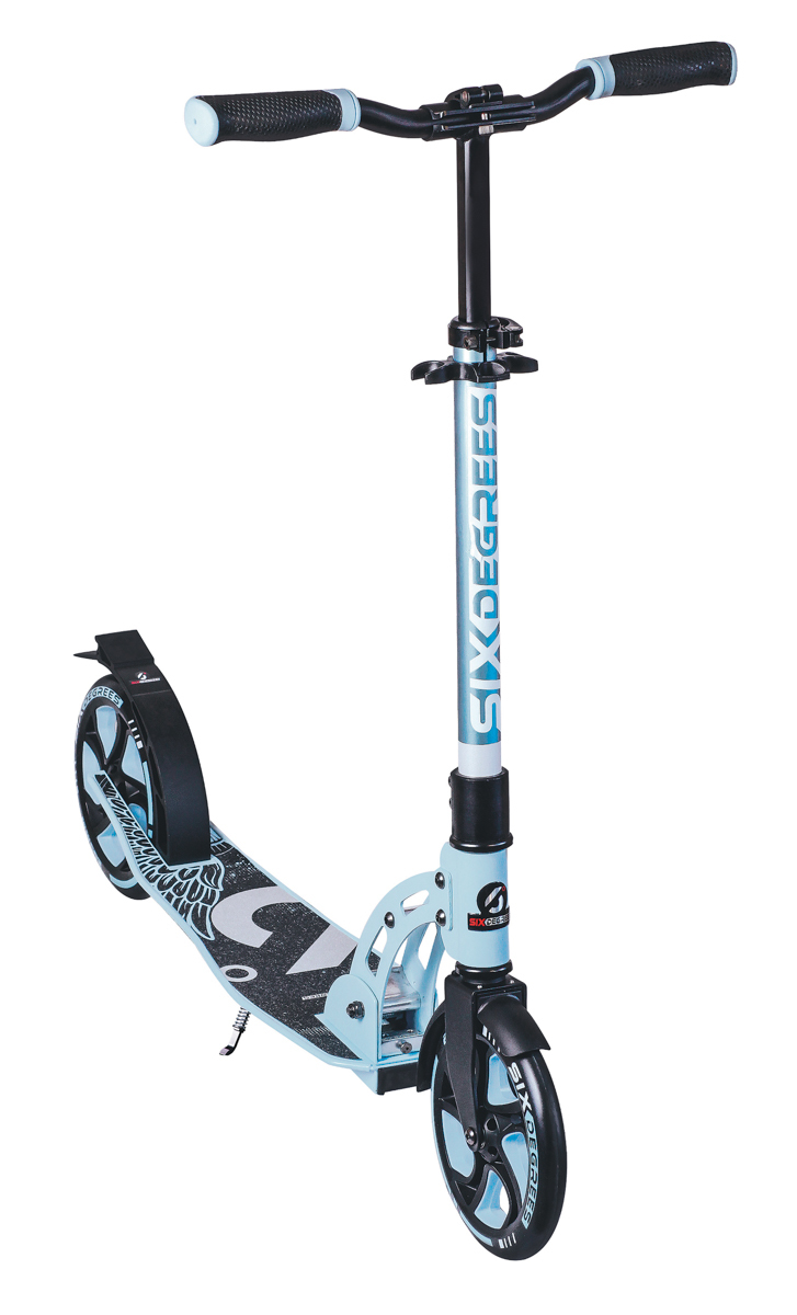 Vysoce kvalitní a plně hliníková skládací koloběžka SIX DEGREES nejen pro malé i velké sportovce. Pastelově modré provedení. Koloběžka je vybavena jednoduchým skládacím mechanismem. Výškově nastavitelná řídítka 77-102 cm. Extra velké stupátko s rozměrem 580 x 150 mm. Extra silná třecí brzda s protiskluzovým povrchem. Litá kola PU 205 mm. Ložiska ABEC 7. Stojánek. Maximální nosnost: 100 kg. Věk: 3+