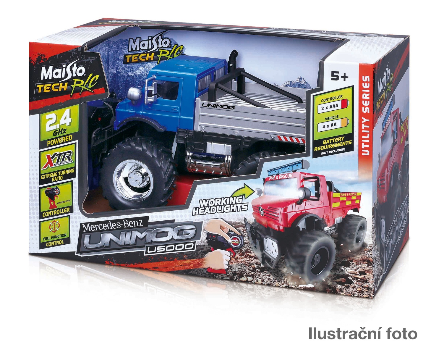 Tech RC, Mercedes-Benz Unimog U5000. RC model Unimog. Kromě jízdy vpřed & vzad a zatáčení vpravo & vlevo má i funkční přední světla. Potřebuje celkem 6 tužkových baterií, které nejsou součástí balení ( 1,5V AA - 2 do vysílače a 4 do modelu. Má 3 kanály = souběžně můžou jezdit až 3 nákladní vozidla. Dosah vysílače: 10 metrů, Rychlost: 4,2 km/h, Doba jízdy: 25 minut. Tip: pří použití akumulátorových baterií 2700 mAh se doba prodlouží až na cca 2,5 hodiny. Délka modelu cca 30 cm. K dispozici dvě varianty: Mercedes-Benz Unimog U5000 a Mercedes-Benz Unimog U5000 - požární vůz. Nevhodné pro děti do 3 let. Assort je náhodný mix modelů. Výběr nelze ovlivnit. Věk: 5+