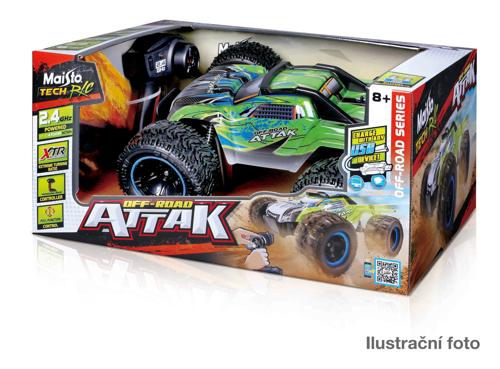 Tech RC, Off-Road Attak. Dálkově ovládaný špičkový RC model + mohutné terénní pneumatiky. Vozidlo: akumulátor 6V NiMH (900 mAh) + nabíjení pomocí USB. Ovladač s proporcionálním ovládáním rychlosti: 2 ks baterie AA 1,5V, které jsou součástí balení. Dosah vysílače: 35 metrů, rychlost: 17,3 km/h, doba jízdy: 12 minut. Frekvence 2,4 GHz umožňuje souběžnou jízdu až se 4 RC modely. Délka modelu cca 37 cm, šířka modelu cca 36 cm. Nevhodné pro děti do 3 let. Věk: 8+