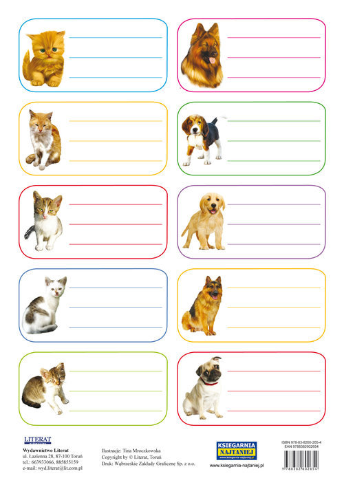 Zestaw 10 naklejek z podobiznami psów i kotów oraz miejscem na opis – do oznaczania zeszytów i książek.