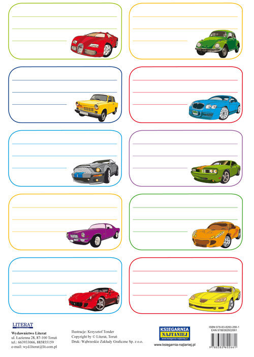 Zestaw 10 naklejek z rysunkami samochodów oraz miejscem na opis – do oznaczania zeszytów i książek. číst celé