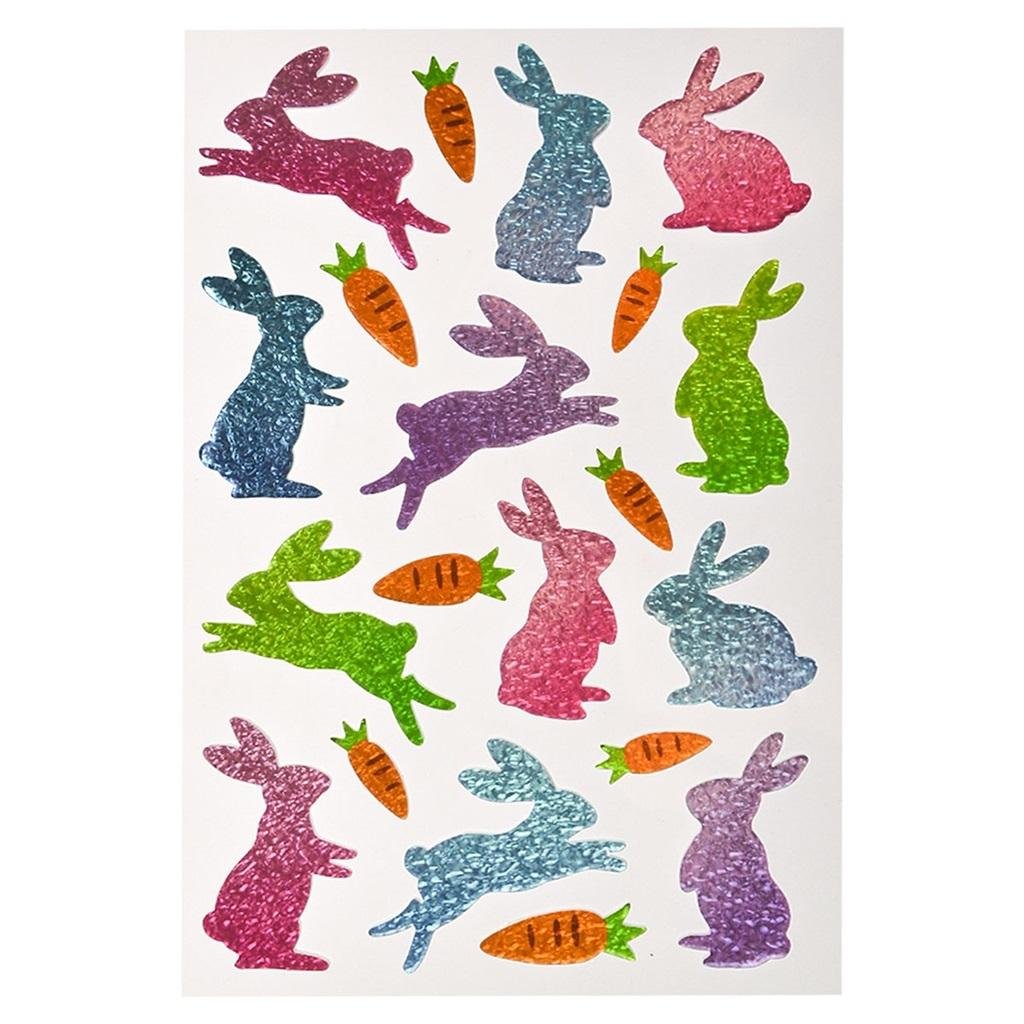 Komplet naklejek holograficznych do dekoracji z różnokolorowymi zajączkami i marchewkami. Pakowane na blistrze o wymiarach: 14,5x25 cm.