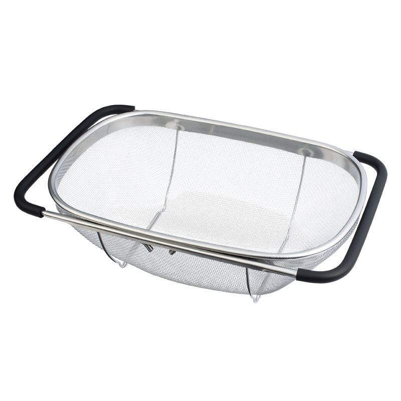 Praktický kuchyňský košík, který lze pohodlně umístit přímo do Vašeho dřezu. Díky vysunovacím rukojetím se dokonale přizpůsobí na šířku jakéhokoliv kuchyňského dřezu. Následně jej můžete využít jako cedník ke slévání těstovin nebo jako síto pro čištění potravin, zeleniny a ovoce. Tento velký cedník je vyrobený z nerezové oceli, má pevnou konstrukci a jeho postranní rukojeti se silikonovou úpravou nekloužou a dobře drží ve dřezu.