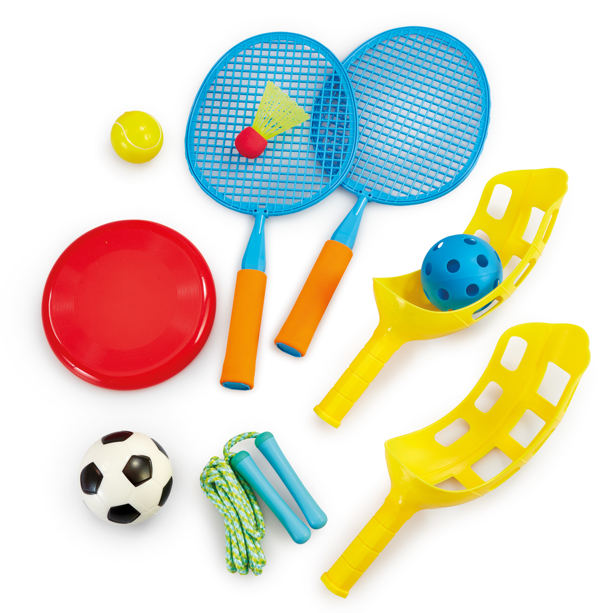 Sada venkovních her obsahuje: pálky, sadu scoop ball, švihadlo, létající talíř, fotbalová síť. Věk: 3+ číst celé