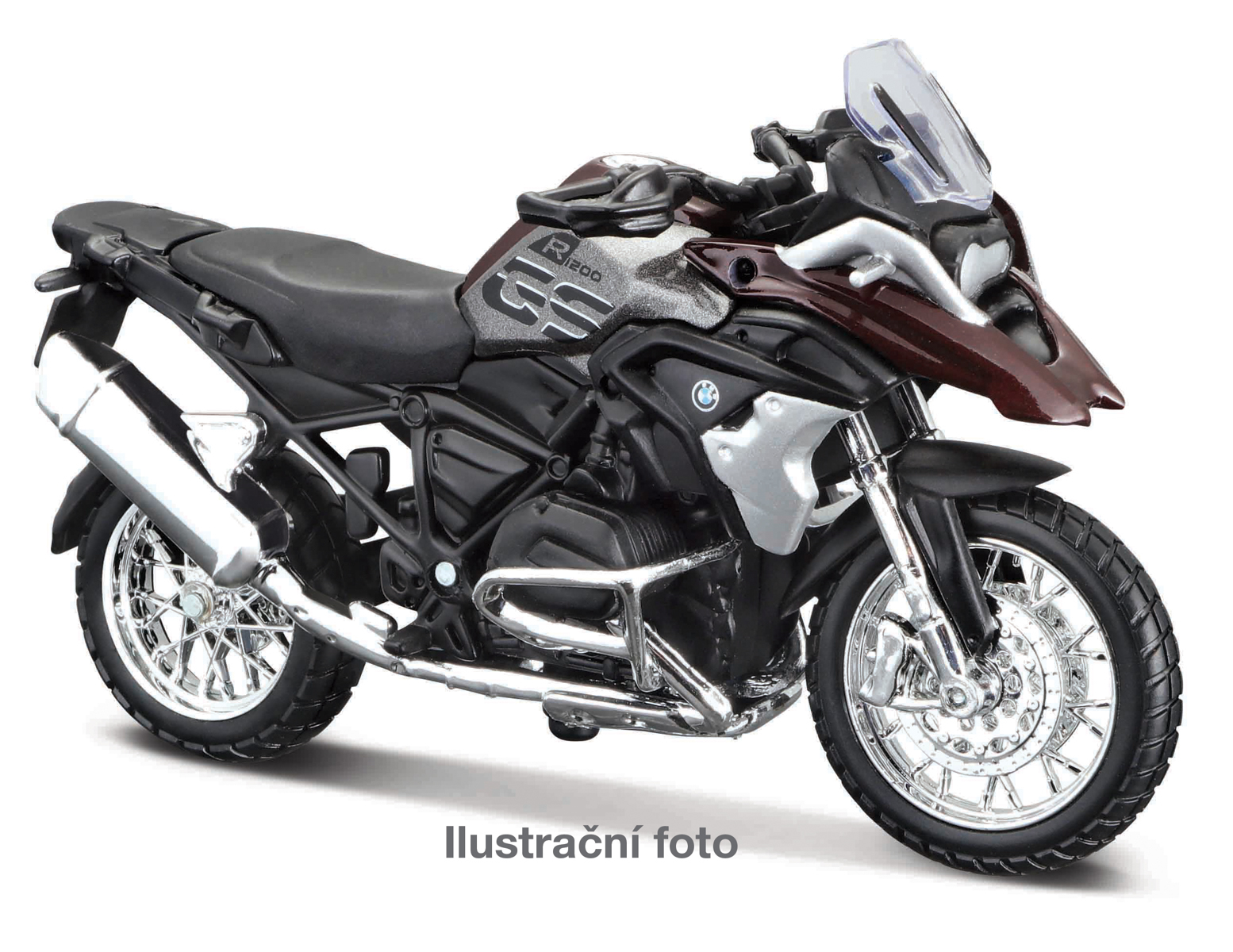 BMW R 1200 GS 2017. Kovové modely motocyklů v modelovém měřítku 1:18. Motocykly mají otáčivá řidítka a odpruženou zadní nápravu. Jsou usazeny na černém plastovém podstavci. Dvě barevné varianty. Assort je náhodný mix modelů. Výběr nelze ovlivnit. Rozměry balení: 16x10,5x7cm. Věk: 3+