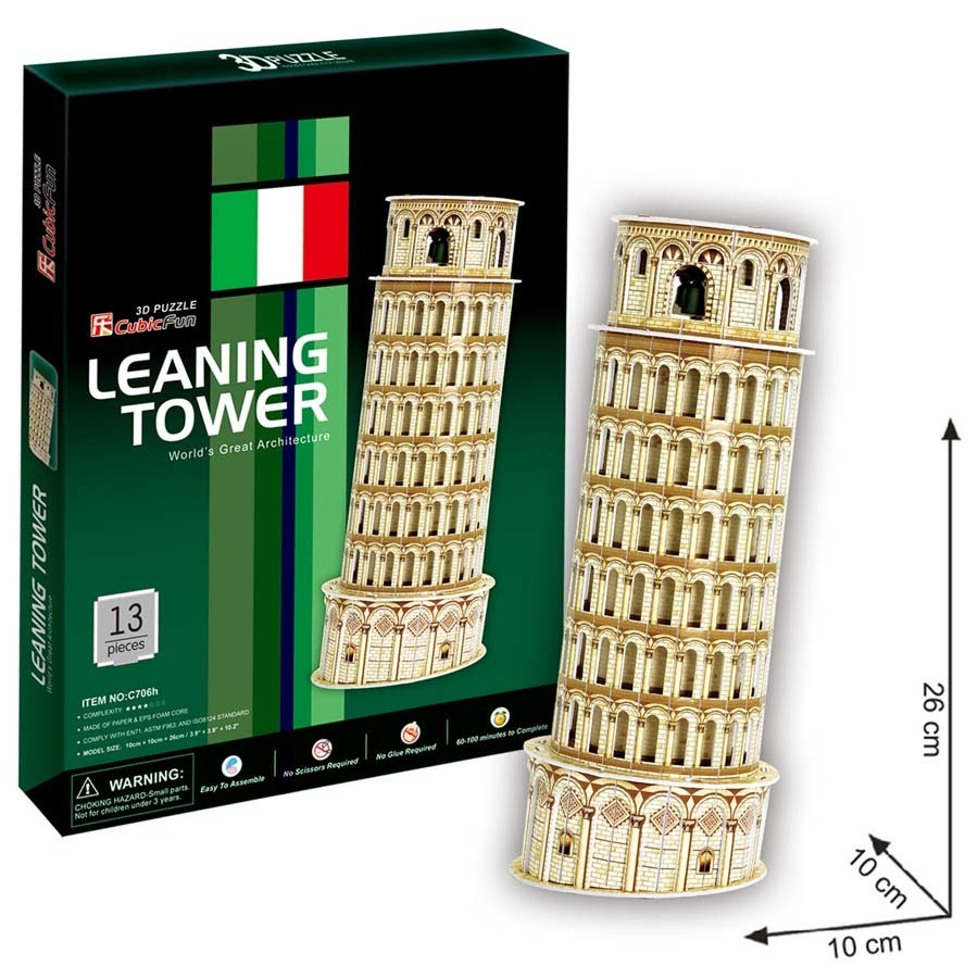 3D puzzle - stavebnice ze série Nejslavnější architektura světa (World's Great Architecture) od CubicFun vyrobená ze speciálního materiálu - asi 3mm silné pěny potažené laminovaným potištěným papírem. Sestavování 3D puzzle Cubicfun je zábavou pro celou rodinu. Hotové modely mohou být sběratelským a dekorativním doplňkem bytu nebo dětského pokoje. Dílky se k sobě sestavují pomocí návodu bez použití lepidla a nůžek - předražené dílky pouze jednoduše vylomíte z archu. Obtížnost 4 , 7. Orientační čas na sestavení: 60 - 100 minut. Šikmá věž (Torre pendente) se nachází v Itálii v Pise. Je vysoká 56 metrů. Věž je postavena z bílého mramoru. Výstavba samostatně umístěné zvonice byla zahájena v roce 1173, ale už krátce po začátku stavby v roce 1173 se začala naklánět. Důvodem jsou mělce založené základy v měkké hornině. Zajímavostí je, že věž se původně nakláněla na opačnou stranu. Stavitelé se rozhodli náklon vyrovnat tím, že do země k základům házeli kameny a větve. Plán sice vyšel a věž se vyrovnala, ale později se začala naklánět znovu, tentokrát na opačnou stranu.