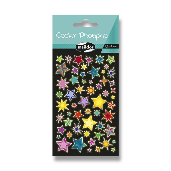 Samolepky Maildor 3D Cooky Phospho s 3D efektem jsou fosforeskující ve tmě s motivy hvězd. Balení obsahuje 1 arch s 57 samolepkami,,Rozměry balení: 7,5 x 12 cm.