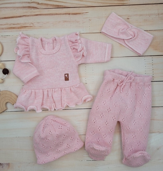 Pletená ažurková sada 4D, tunika, polodupačky, čepička + čelenka Kazum, růžová, vel. 68; 68 (3-6m)