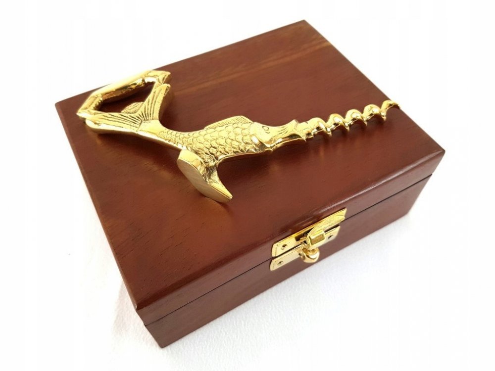 Mosazná Rybička - vývrtka a otvírák na láhve v dřevěné krabičce