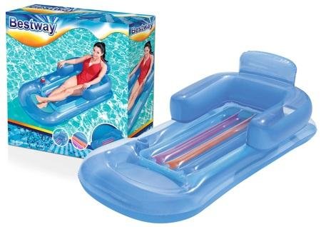 Dmuchany Materac, Fotel 157 x 89 cm Bestway 43028 Bardzo wygodny i praktyczny materac przyda się wszystkim miłośnikom zarówno wody jak i spędzania czasu na plaży. Materac może służyć zarówno jako klasyczny materac do pływania jak i do opalania. Dodatkowym atutem, który zapewni Ci wygodę i relaks są podłokietniki i dmuchane oparcie. Klasyczny niebieski kolor w połączeniu z tęczowymi elementami z pewnością przypadną Ci do gustu. Materac zawiera również otwór na napój dzięki czemu nie będziesz musiał wychodzić z wody aby móc napić się swojego ulubionego napoju. Dane techniczne: - wymiary 161 cm x 84 cm - wygodne dmuchane oparcie i podłokietnik - łatka naprawcza w zestawie - dmuchany zagłówek -otwór na napój - przeznaczony dla osób powyżej 14 roku życia - materiał PVC - maksymalne obciążenie 90 kg Waga: 1,3 kg Wymiary opakowania: 24 cm x 24 cm x 7 cm
