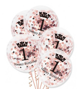 Průhledné balonky První narozeniny s RoseGold konfetami - 30 cm, 5 ks