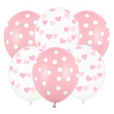 Balonky růžové s potiskem 30 cm - puntíky a srdíčka, 6 ks