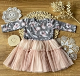 Šaty s tylovou sukní dlouhý rukáv, Pivoňka, Mamatti, meruňkovo/šedé, vel. 80/86