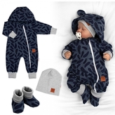 Rostoucí teplákový overal pro miminko, čepice, botky, 3D, Nature - jeans pírka, 68/74; 68/74 (6-9m)