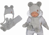 Z&Z Pletená čepice s bambulemi, šálou a rukavičky 3v1, šedá, vel. 68/74