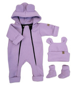Oteplený dětský overal bez šlapek s kapucí, čepička + botičky, 3D, Kazum, lila, vel. 80; 80 (9-12m); fialová
