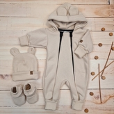 Oteplený dětský overal bez šlapek s kapucí, čepička + botičky, 3D, Kazum, béžový; 56 (1-2m)