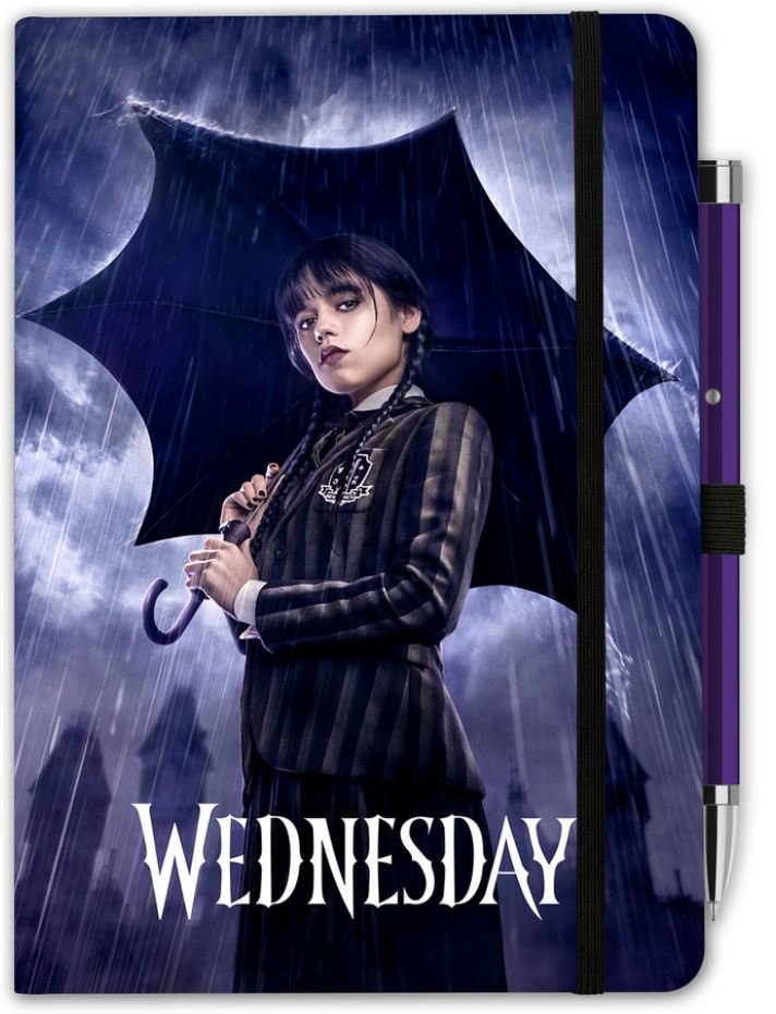 Zápisník s grafikou postavy Wednesday s ikonickým černým deštníkem. Součástí je promítací pero.