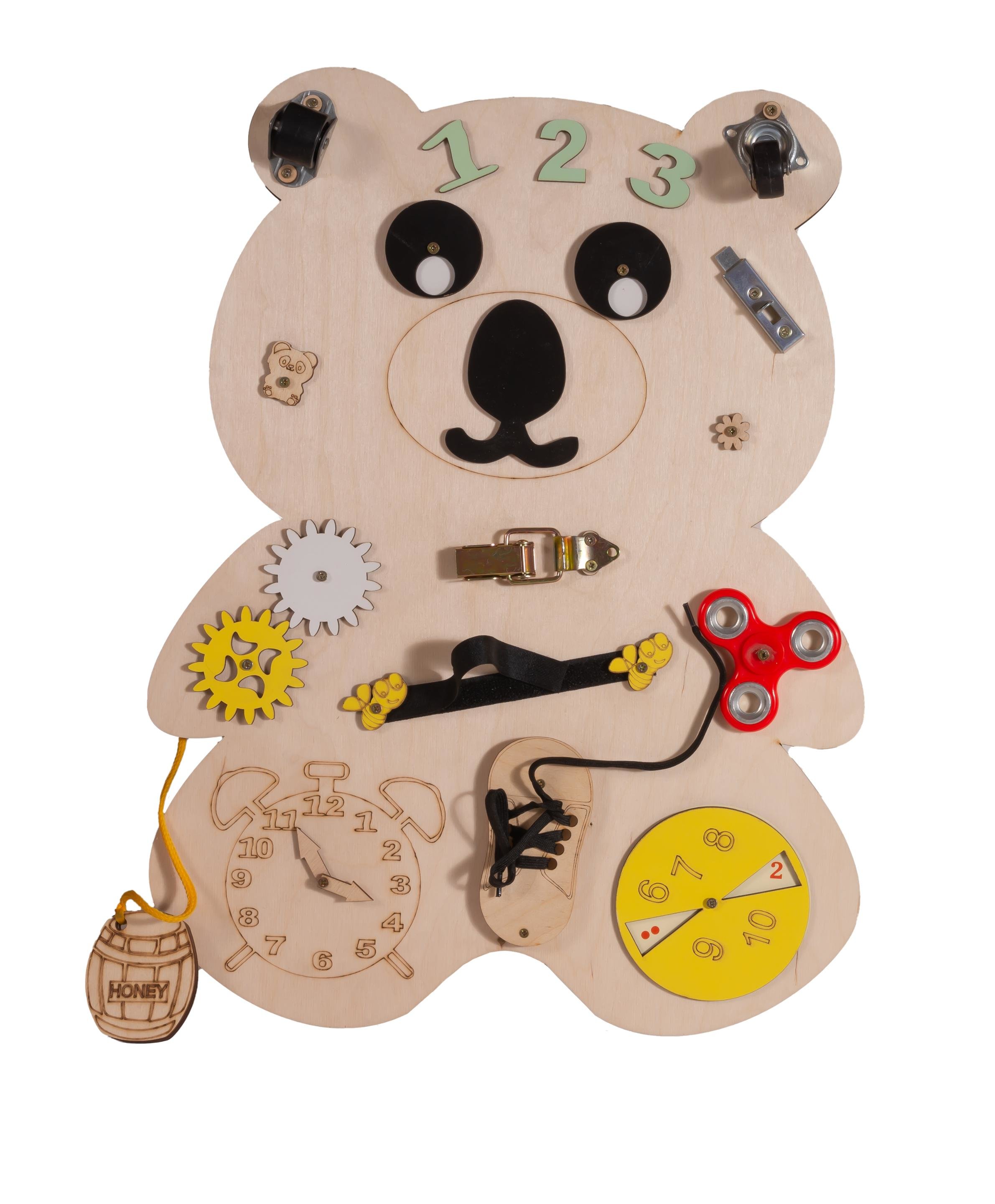 Tablica manipulacyjna MIŚ Wyposażenie: • ruchome oczy • zamek walizkowy • kolorowe cyferki drewniane • ruchome kolorowe zębatki • rzep • zasuwka • but ze sznurówką (nauka sznurowania) • ruchome i obrotowe kółka do mebli • ruchome kółko z cyferkami • spinner • wisząca beczułka miodu • zegar z ruchomymi wskazówkami Wymiary: 48 x 37 x 6,5 cm.