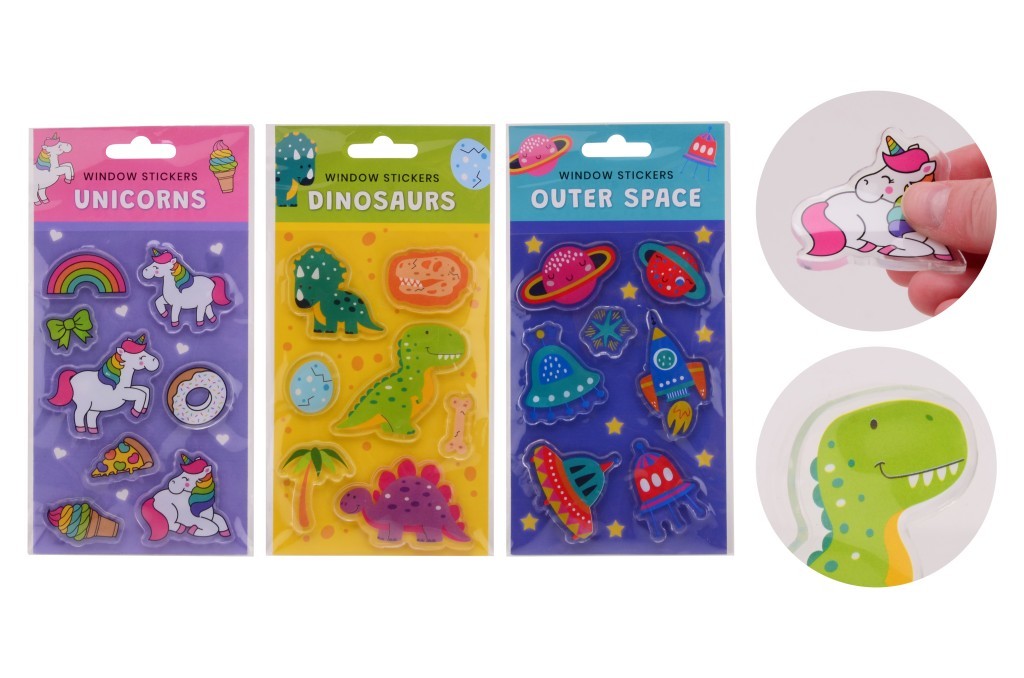 Tento set transparentních, opakovaně použitelných samolepek nabízí tři oblíbené motivy - vesmír, dinosauři a jednorožec. Samolepky můžete jednoduše nalepit na okno, kdykoli je z okna sundat a znovu použít na jiném místě nebo po opravení kompozice. Jsou ideální nejen na okna, ale i na jiné hladké povrchy, kde chcete vytvořit zajímavé barevné akcenty bez trvalých škod.