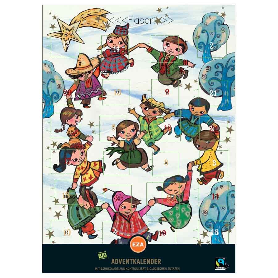 Bio mléčná čokoláda v tomto kalendáři se obešla bez emulgátorů a samozřejmě i bez náhražek a cizích tuků. Pouze skutečná bio mléčná čokoláda s certifikací Fairtrade, která mimo jiné zakazuje dětskou práci a nabízí pěstitelům důstojnou mzdu za jejich produkci.